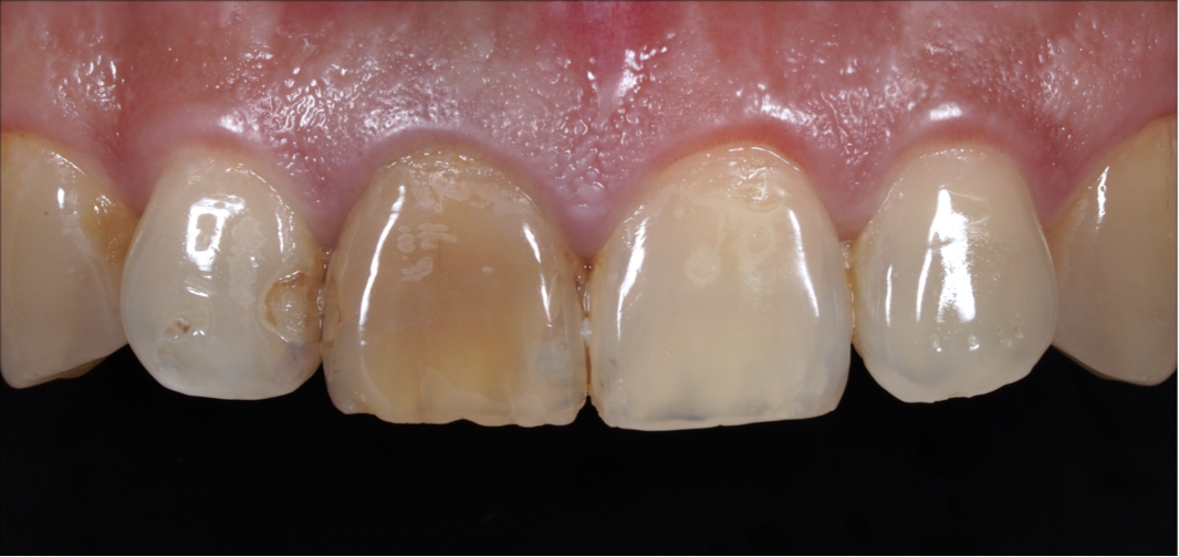 最困難的部分是這顆門牙整體都已發黑——若假牙的厚度及邊緣設計沒做好,顏色很容易穿透、被發現是假牙。